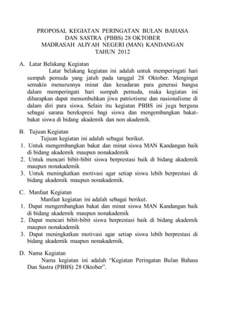 A.panitia b.latar belakang c.tujuan d.format notula e.anggaran biaya 74.kegiatan pelatihan kepemimpinan akan dilaksanakan pada hari sabtu 10 oktober 2015, jam 15.00 di aula sekolah. Dalam proposal, bagian tersebut lebih tepat dimasukan ke bagian …. 3) bahasa indonesia adalah bahasa orang indonesia yang dipandang tidak ilmiah. 9.kegiatan pelatihan kepemimpinan akan dilaksanakan pada hari sabtu 10 oktober 2015, jam 15.00 di aula sekolah. Berikut ini hal yang tidak perlu dicantumkan dalam proposal penyelenggaraan lomba peringatan sumpah pemuda adalah….